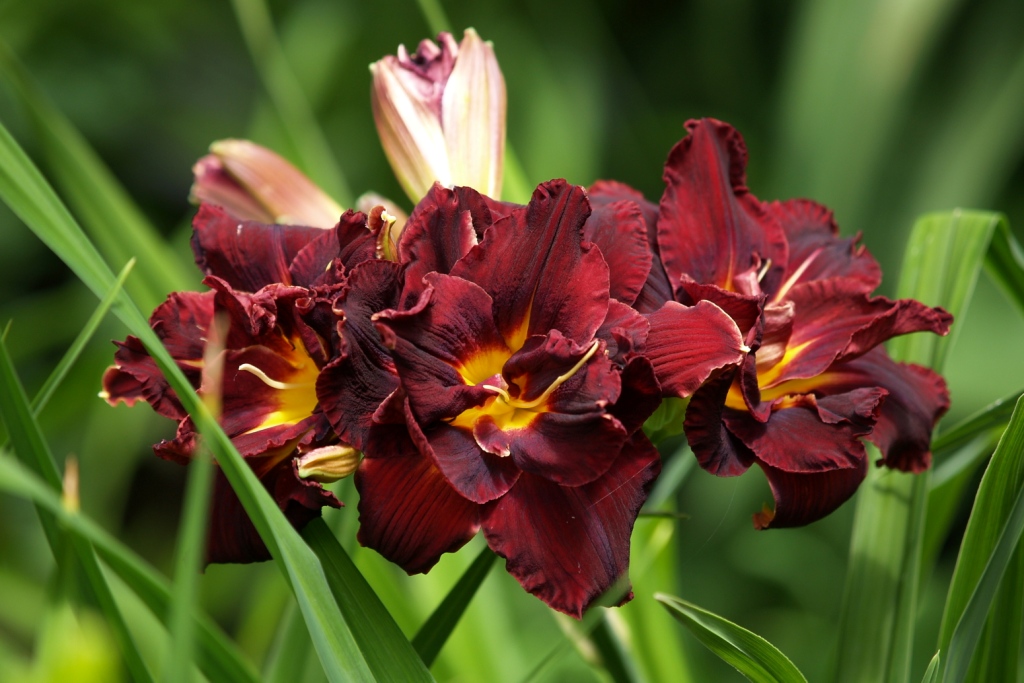 A very dark windsor red, Tribal Council is one of the earliest blooms in June. We love the heavy ruffling and the hose in hose form.